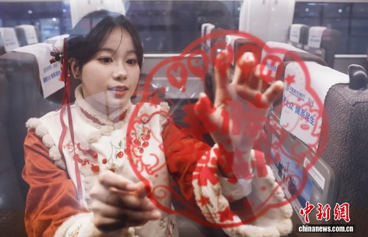 2月2日,列车员在高铁列车车厢内张贴新春主题窗花。中新社记者 殷立勤 摄