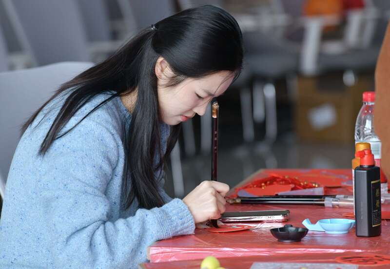 同学们在写福字、拓福等年俗体验区年味十足,执笔挥毫,将新春的祝福凝于方寸红纸。