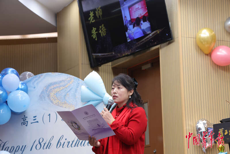 2月28日,北京理工大学附属中学高中部,高三(一)班举行班级成人礼活动,班主任为班里同学们送上祝福语,祝愿他们成人快乐,高考顺利。值得一提的是,她的孩子也是今年高考大军中的一员,并且恰好在她所带的班级里。中青在线记者 陈思阳/摄