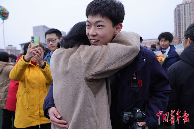 2月28日,北京理工大学附属中学高中部,活动上一位母亲给孩子一个大大的拥抱,祝贺儿子成人。中青在线记者 陈思阳/摄
