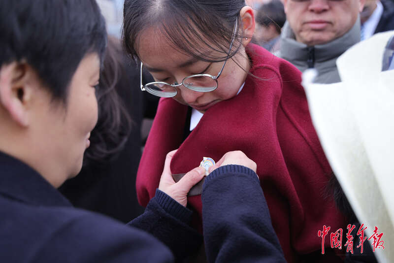 2月28日,北京理工大学附属中学高中部,家长为自己的孩子戴上成人礼奖章。中青在线记者 陈思阳/摄