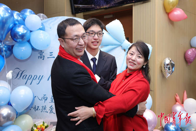 2月28日,北京理工大学附属中学高中部,高三(一)班举行班级成人礼活动,一家三口共同庆祝孩子的成人仪式。中青在线记者 陈思阳/摄