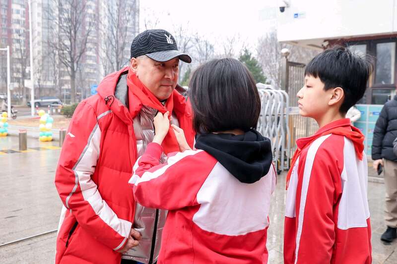 潞河中学附属学校学生为李永波戴上红领巾。潞河中学附属学校供图