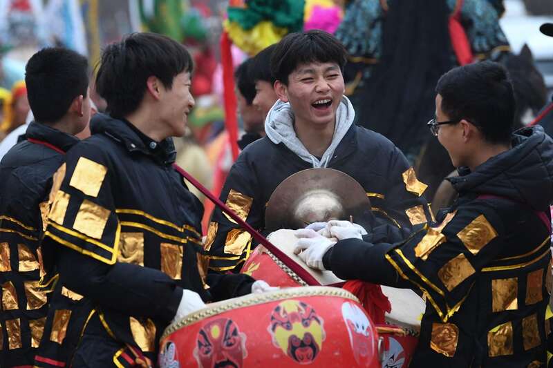 3月2日,陇县黄花峪村社火队的锣鼓队员在游演。新华社记者 邹竞一 摄