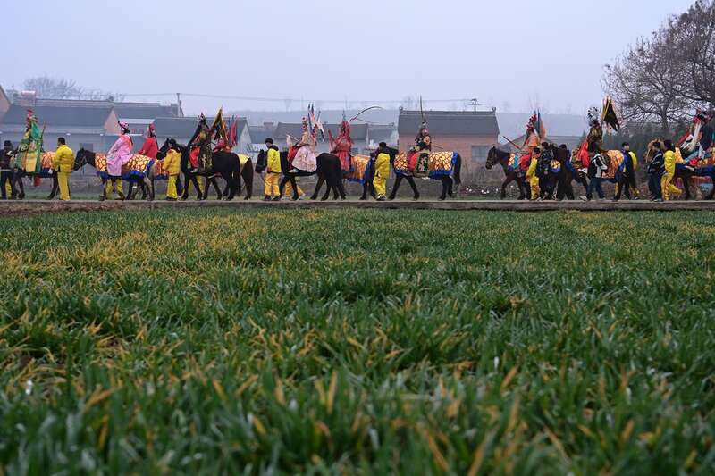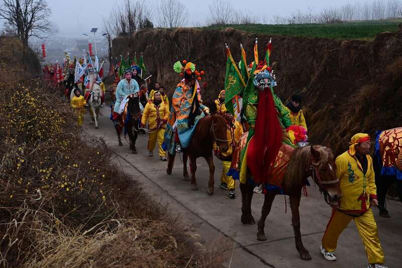 3月2日,陇县黄花峪村社火队在游演途中。新华社记者 邹竞一 摄