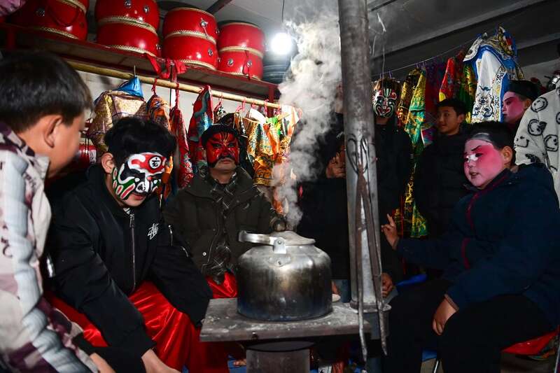 3月2日凌晨,陇县黄花峪村社火队队员在吃早饭。新华社记者 邹竞一 摄
