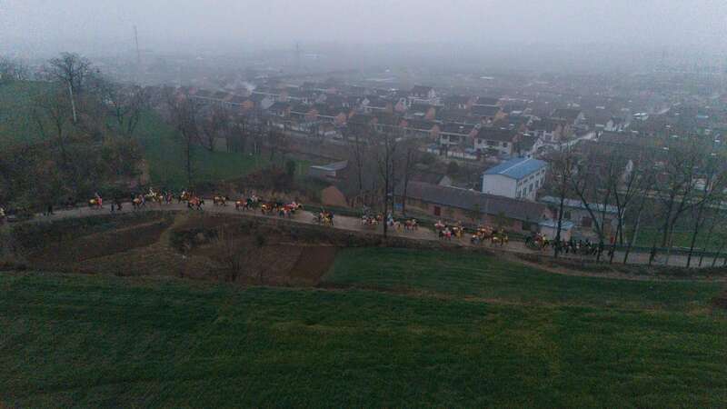 3月2日,陇县黄花峪村社火队在游演途中(无人机照片)。新华社记者 邹竞一 摄