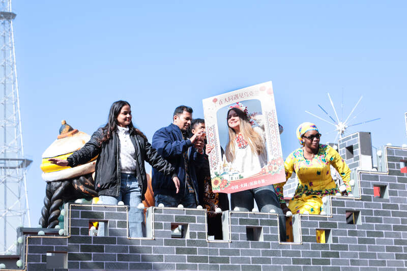 仿古城墙造型的彩车上,外国友人手持相框笑意盈盈,“在大同遇见乌克兰”的标语格外醒目。