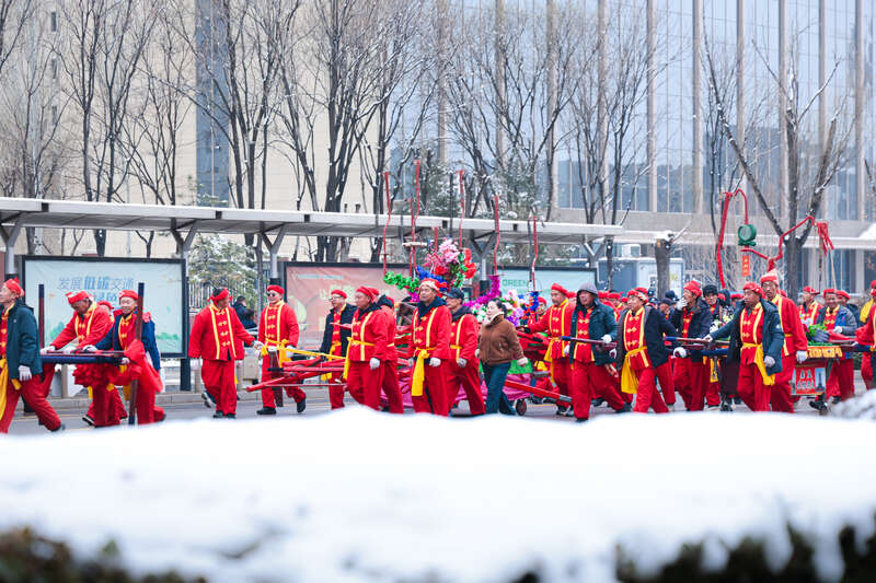 林立的高楼间,社火表演队伍列阵排开,火红服饰如燎原星火般铺展。