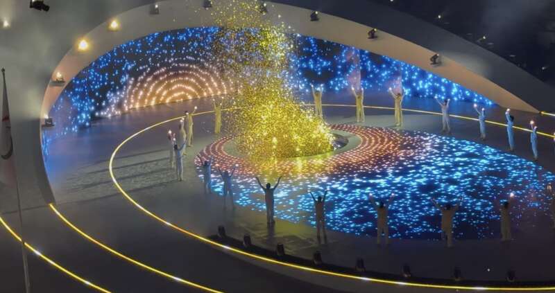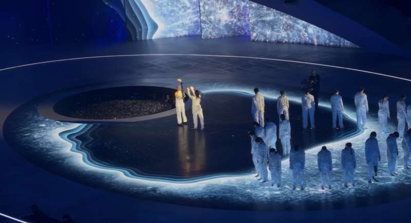 最终,意大利轮椅击剑运动员贝贝·维奥手持火炬入场,表演者“接住”火炬之光,用手传递,一团由光影与微粒组成的“火焰”在舞台升腾。与此同时,大屏幕上,位于米兰与科尔蒂纳的两位火炬手分别点燃两座火炬塔,照亮为期9天的赛事征程。