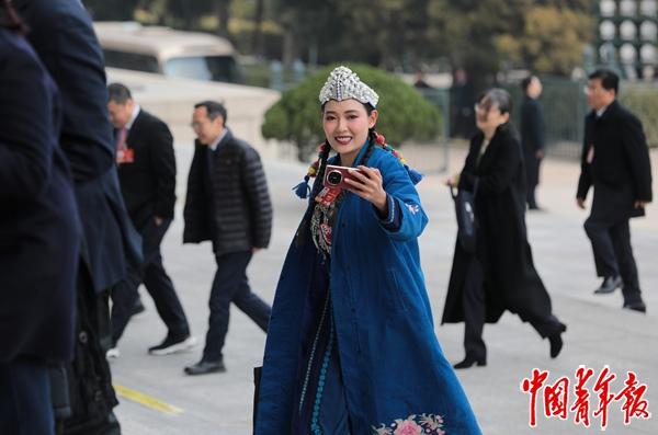 3月7日,北京,人民大会堂,全国政协十四届四次会议第二次全体会议开始前,杨钰尼委员一边走向会场,一边用手机拍摄Vlog。杨钰尼是一名来自云南的95后哈尼族姑娘,也是非遗保护传承工作者。中青报·中青网记者 陈剑/摄