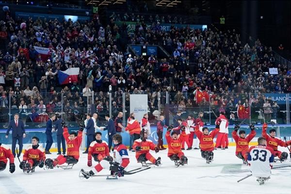 当地时间3月15日,在米兰举行的米兰-科尔蒂纳冬残奥会残奥冰球铜牌赛中,中国队3∶2战胜捷克队,夺得季军。新华社记者 李京/摄