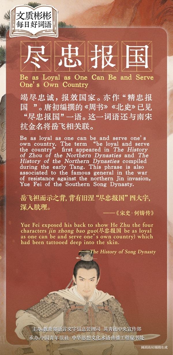 Be as loyal as one can be and serve one's own country. The term "be loyal and serve the country" first appeared in The History of Zhou of the Northern Dynasties and The History of the Northern Dynasties compiled during the early Tang. This phrase is also associated with the famous general in the war of resistance against the northern Jin invasion, Yue Fei of the Southern Song Dynasty.