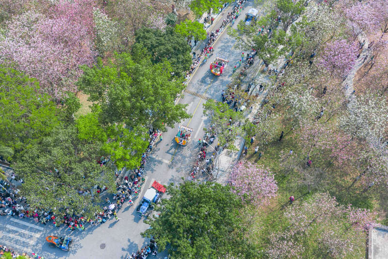 在科技文化巡游环节,由智能农机主题花车组成的科技方阵尤为吸睛——车身装饰着节水抗旱稻、荔枝、蓝莓等华农主导研发的农产品,集中展示学校农业科技创新实力;广州体育学院龙狮队领头前行,小马造型气球方阵、粤剧少儿鳌鱼花灯方阵依次亮相;华农汉服社、龙狮团、无人机协会等社团组成的特色方阵,将青春与传统交融的氛围感拉满。
