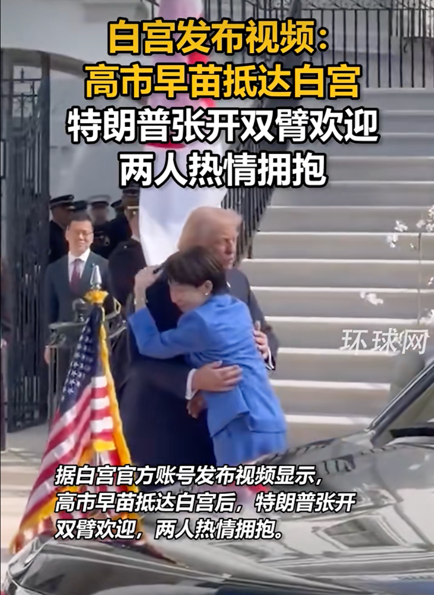 另据环球网报道,白宫官方账号发布视频显示,高市早苗抵达白宫后,特朗普张开双臂欢迎,刚伸出手,高市早苗就紧紧抱住特朗普。