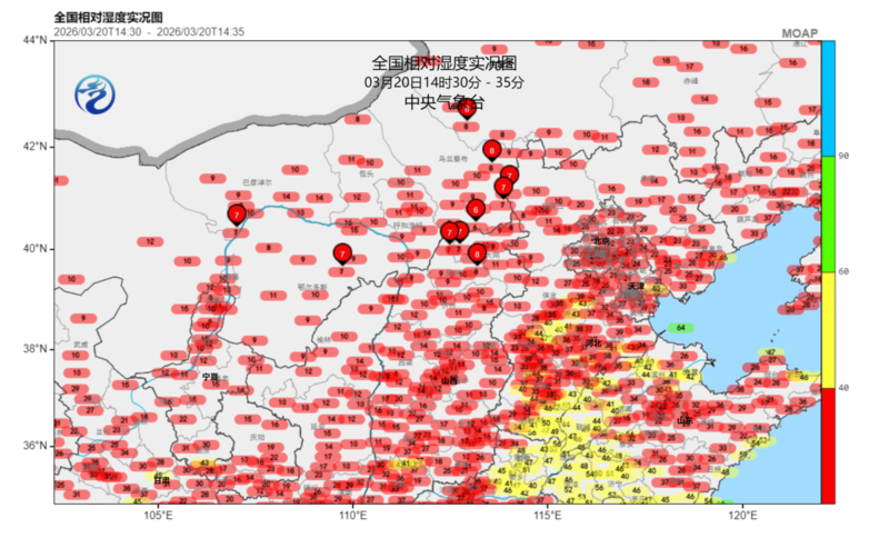 明天暖湿气流加强北上,华北、黄淮一带的湿度会略有提高,但后天起冷空气南下,空气又会重新变得十分干燥。