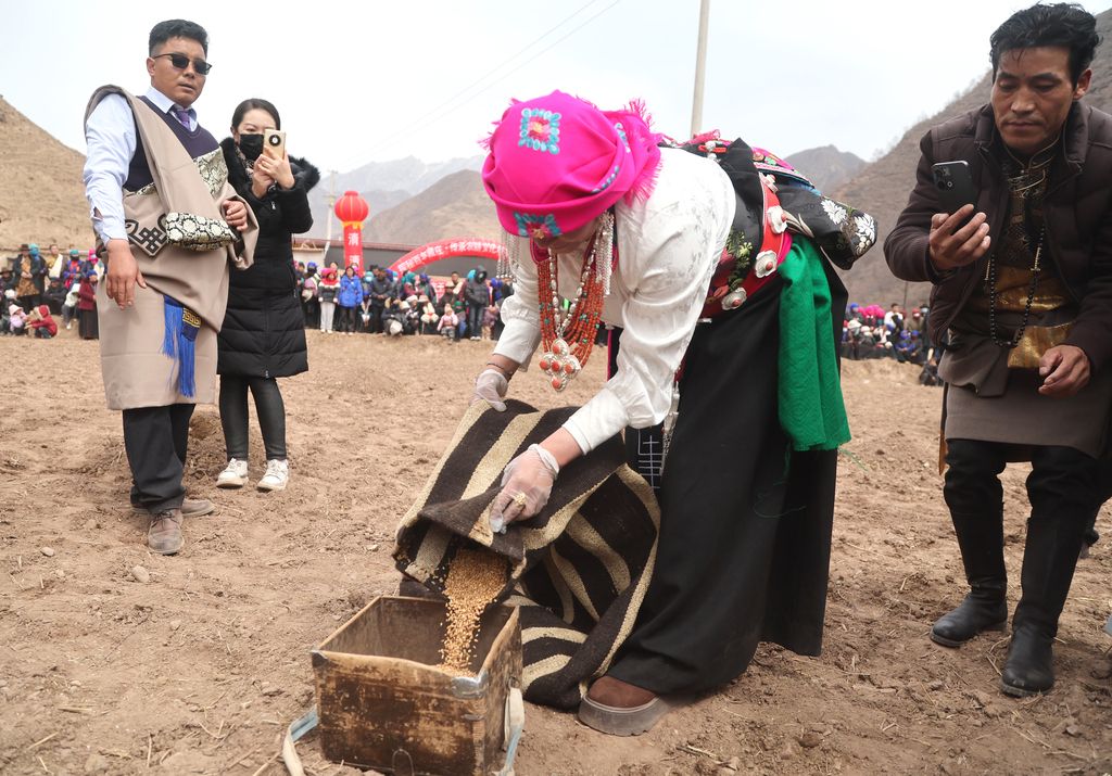 2026年3月21日,在青海省化隆回族自治县塔加藏族乡,民众身着盛装,遵循传统习俗,牵引耕牛,在素有 “百年藏庄” 之称的塔二村举行春耕仪式,播撒春日第一粒种子。图为民众在春耕仪式上准备种子。 中新社记者 张忠苹 摄