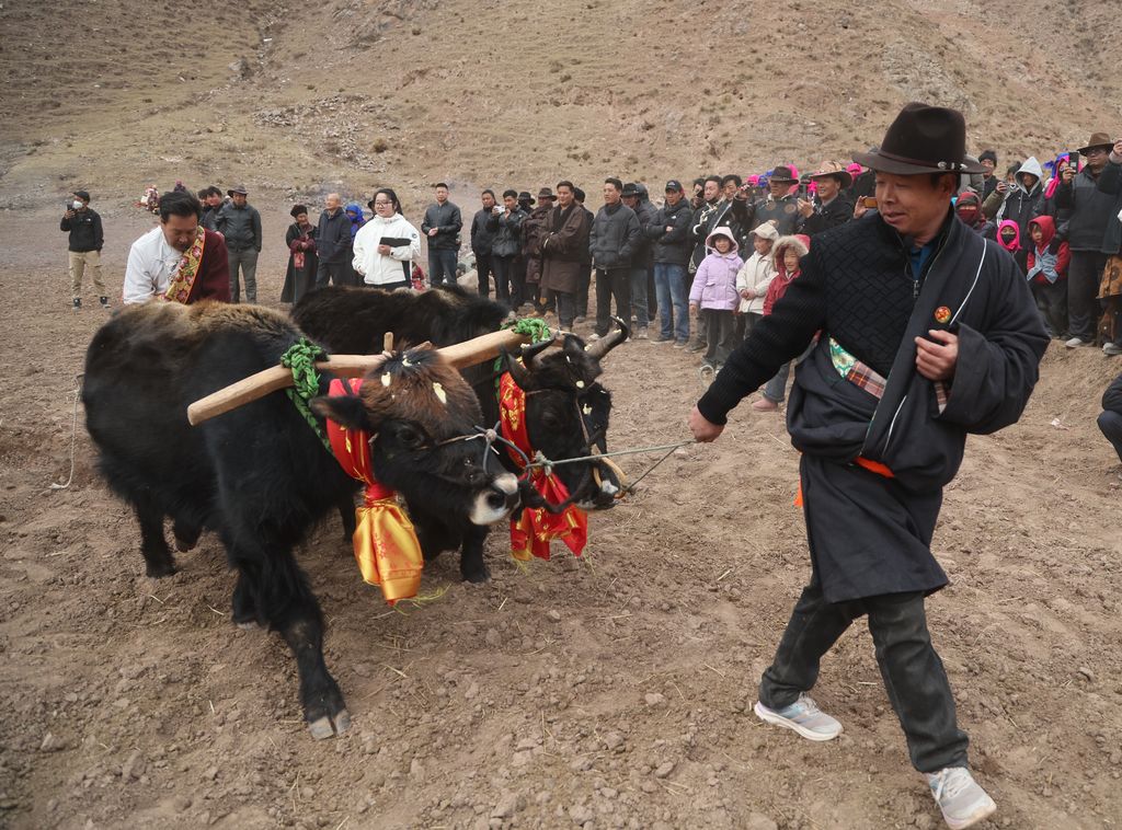 2026年3月21日,在青海省化隆回族自治县塔加藏族乡,民众身着盛装,遵循传统习俗,牵引耕牛,在素有“百年藏庄”之称的塔二村举行春耕仪式,播撒春日第一粒种子。图为民众以“二牛抬杠”耕作模式开启春耕。中新社记者 张忠苹 摄