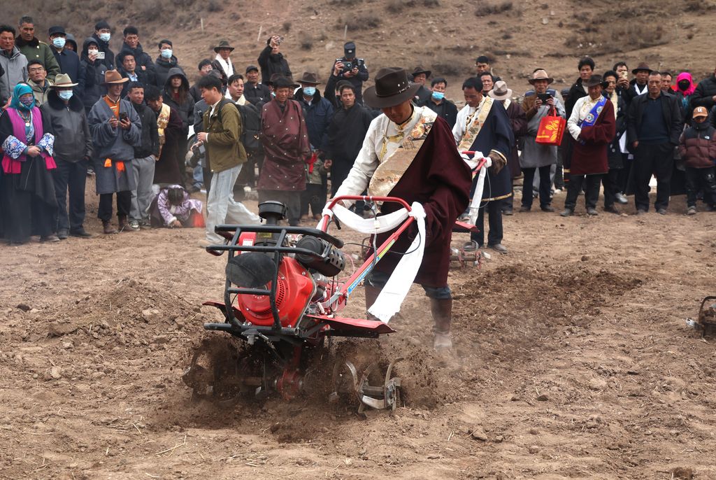 2026年3月21日,在青海省化隆回族自治县塔加藏族乡,民众身着盛装,遵循传统习俗,牵引耕牛,在素有 “百年藏庄” 之称的塔二村举行春耕仪式,播撒春日第一粒种子。图为村民使用耕地机耕地。 中新社记者 张忠苹 摄