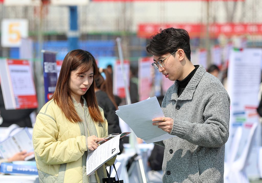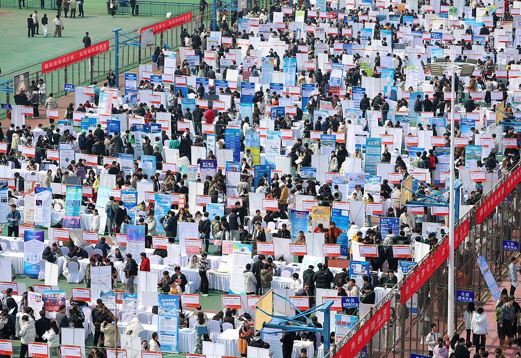 2026年3月20日,山东青岛,大学生在招聘摊位前了解职位信息。