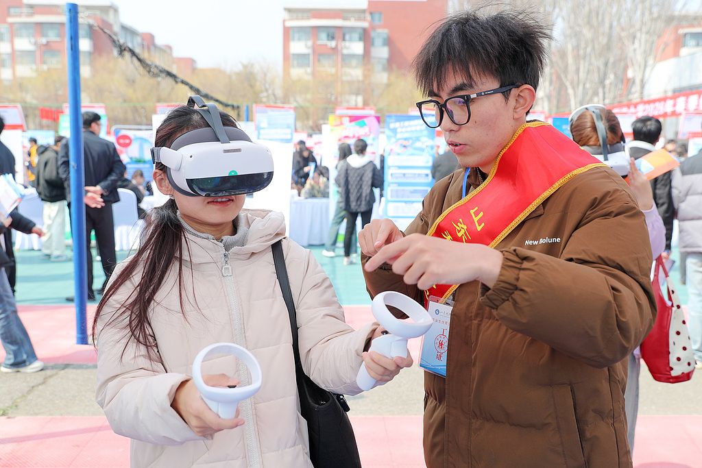 2026年3月20日,山东青岛,在山东科技大学春季校园双选会现场,大学生在VR职业体验区参与互动。