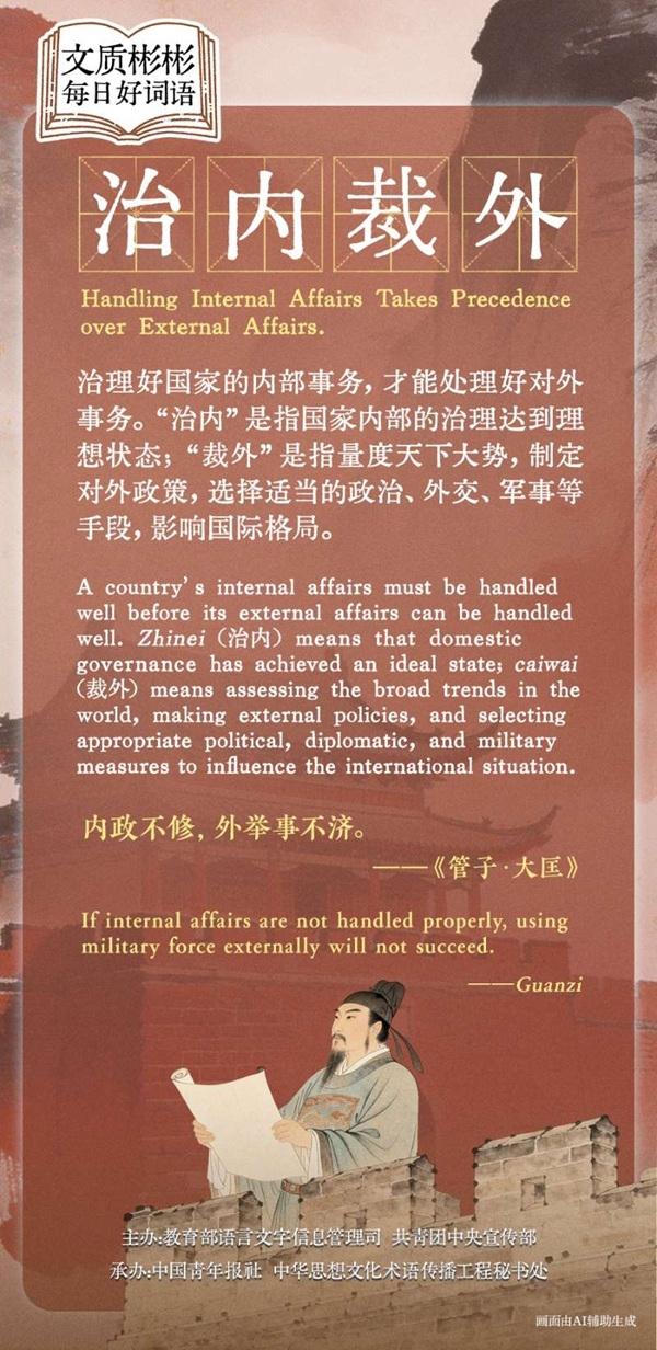 A country's internal affairs must be handled well before its external affairs can be handled well. Zhinei means that domestic governance has achieved an ideal state; caiwai means assessing the broad trends in the world, making external policies, and selecting appropriate political, diplomatic, and military measures to influence the international situation.