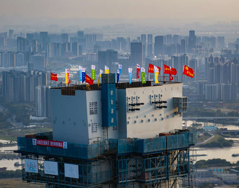 智能化设备叠加精细化管理,创造出一条加速上升的进度曲线:塔柱首个100米耗时一年,第二个100米用时6个月,第三个100米仅用4个月……工程创下工效最高6天一节的行业新纪录,300米高塔的垂直度偏差在10毫米内,高于指标要求。