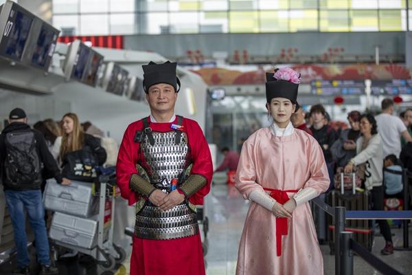 北京首都国际机场问询柜台的工作人员,身着明制汉服、头梳发髻,温婉大方地为旅客提供服务;广州白云国际机场,“宋服卫士”亮相防爆检查与巡逻岗位,女安保人员发间点缀寓意富贵吉祥的粉色牡丹簪花,用“叉手礼”和一声“客官,这边请”让旅客恍若穿越……