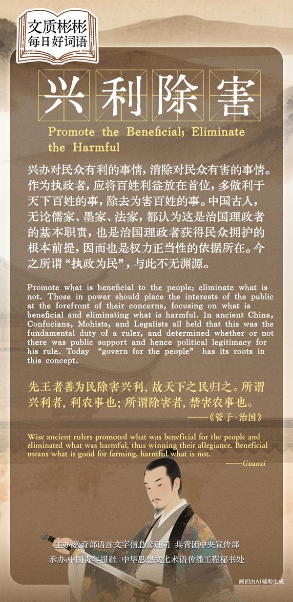 兴办对民众有利的事情,消除对民众有害的事情。作为执政者,应将百姓利益放在首位,多做利于天下百姓的事,除去为害百姓的事。中国古人,无论儒家、墨家、法家,都认为这是治国理政者的基本职责,也是治国理政者获得民众拥护的根本前提,因而也是权力正当性的依据所在。今之所谓“执政为民”,与此不无渊源。
