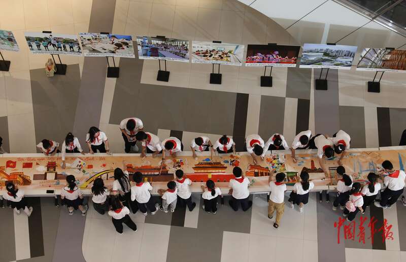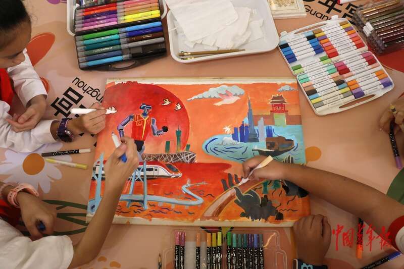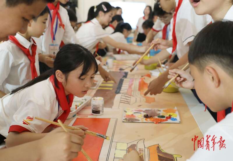 4月12日,广东省广州市第三少年宫,“中越少先队员共绘一幅画”活动在这里举行。越南青年来华“红色研学之旅”之“不忘初心”研学营少先队分团的少先队员、少先队辅导员和中国广东省广州市的少先队员、少先队辅导员等共同参与。画卷中,有中共一大会址、越中友谊宫等红色地标,有万里长城、天安门、越南文庙、顺化皇城等文化遗产,有复兴号高铁、天宫、越南金桥、地标塔81等两国现代化建设成果,寓意中越两国人文相亲、命运与共、情谊深厚,表达了两国少先队员传承红色基因、共创美好未来的共同心愿。中青报·中青网记者 陈剑/摄