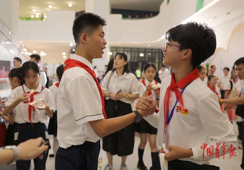 4月12日,广东省广州市第三少年宫,“中越少先队员共绘一幅画”活动结束后,来自中国的程彦卓(左)与来自越南的高富贵(右)交流互动,并握手致意。中青报·中青网记者 陈剑/摄