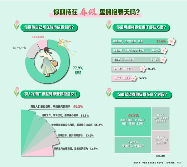 设立并推广春假有哪些意义?数据显示,六成(60.2%)受访青年认为能满足人们亲近自然、享受春光的需求;56.8%的受访青年觉得可以缓解工作、学习压力,兼顾身心健康;55.3%的受访青年表示有利于传承传统节日文化习俗,增强春日仪式感。其他还有:错峰出游,提升假期体验(53.0%);带动地方文旅消费,激发经济活力(42.5%)等。