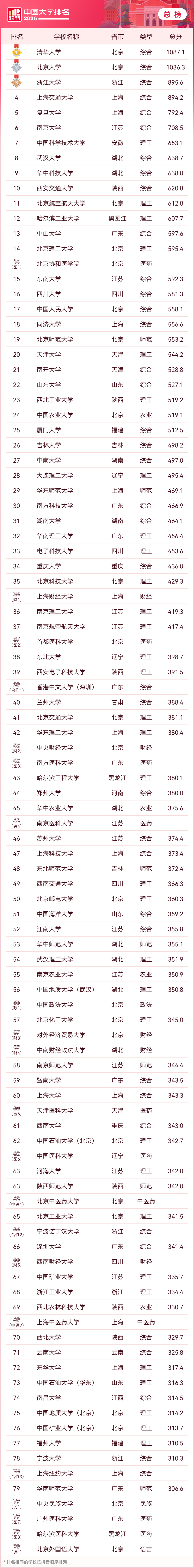 中国青年报客户端讯(中青报·中青网记者 李思)4月15日,高等教育专业评价机构软科正式发布“2026软科中国大学排名”。清华大学、北京大学、浙江大学占据主榜(即综合性大学排名)前三位。