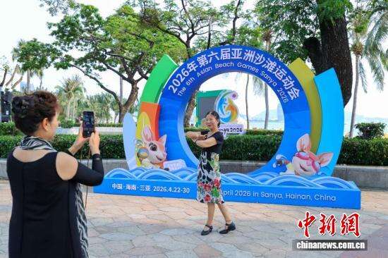 中新社记者 骆云飞 摄 三亚海月广场的第六届亚洲沙滩运动会主题景观引游客打卡拍照。