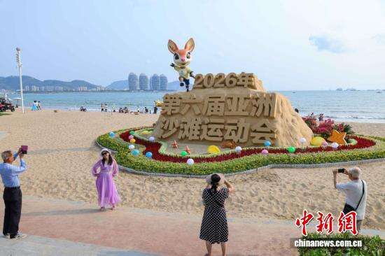 中新社记者 骆云飞 摄 第六届亚洲沙滩运动会主题沙雕亮相三亚湾,吸引游客打卡拍照。