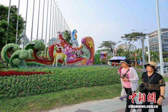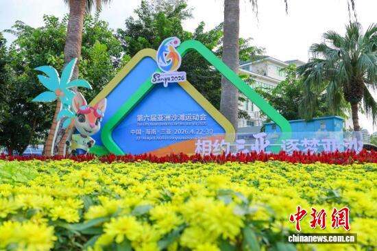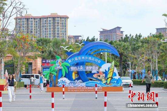 中新社记者 骆云飞 摄 4月20日,第六届亚洲沙滩运动会的宣传标识与主题景观亮相三亚街头,营造浓厚盛会氛围。第六届亚洲沙滩运动会将于4月22日至30日在海南省三亚市举办。图为民众从第六届亚洲沙滩运动会主题花坛前经过。