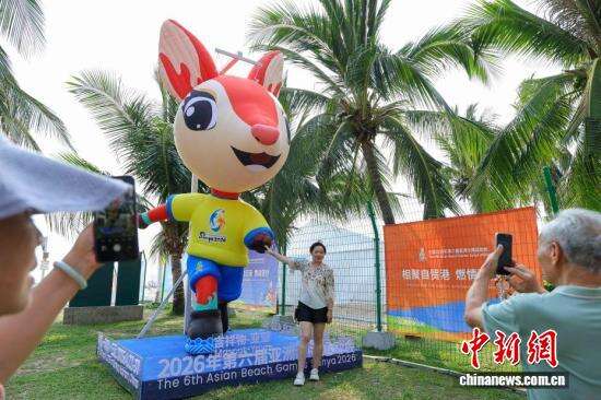 中新社记者 骆云飞 摄 游客与第六届亚洲沙滩运动会吉祥物“亚亚”合影。