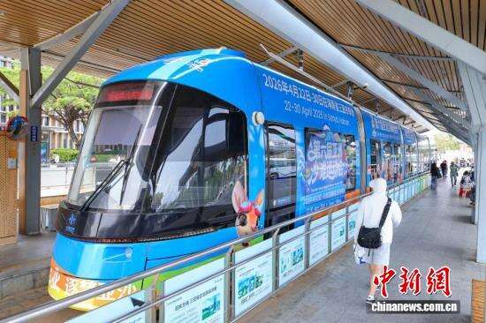 中新社记者 骆云飞 摄 印有第六届亚洲沙滩运动会标识与吉祥物的主题有轨电车。