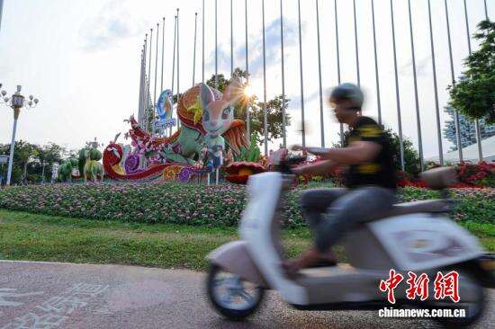 中新社记者 骆云飞 摄 市民骑电动车从第六届亚洲沙滩运动会主题花坛前经过。