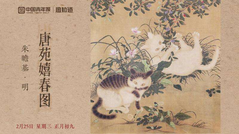 《唐苑嬉春图》绘五只猫咪形态各异,憨态可掬,萌趣盎然。