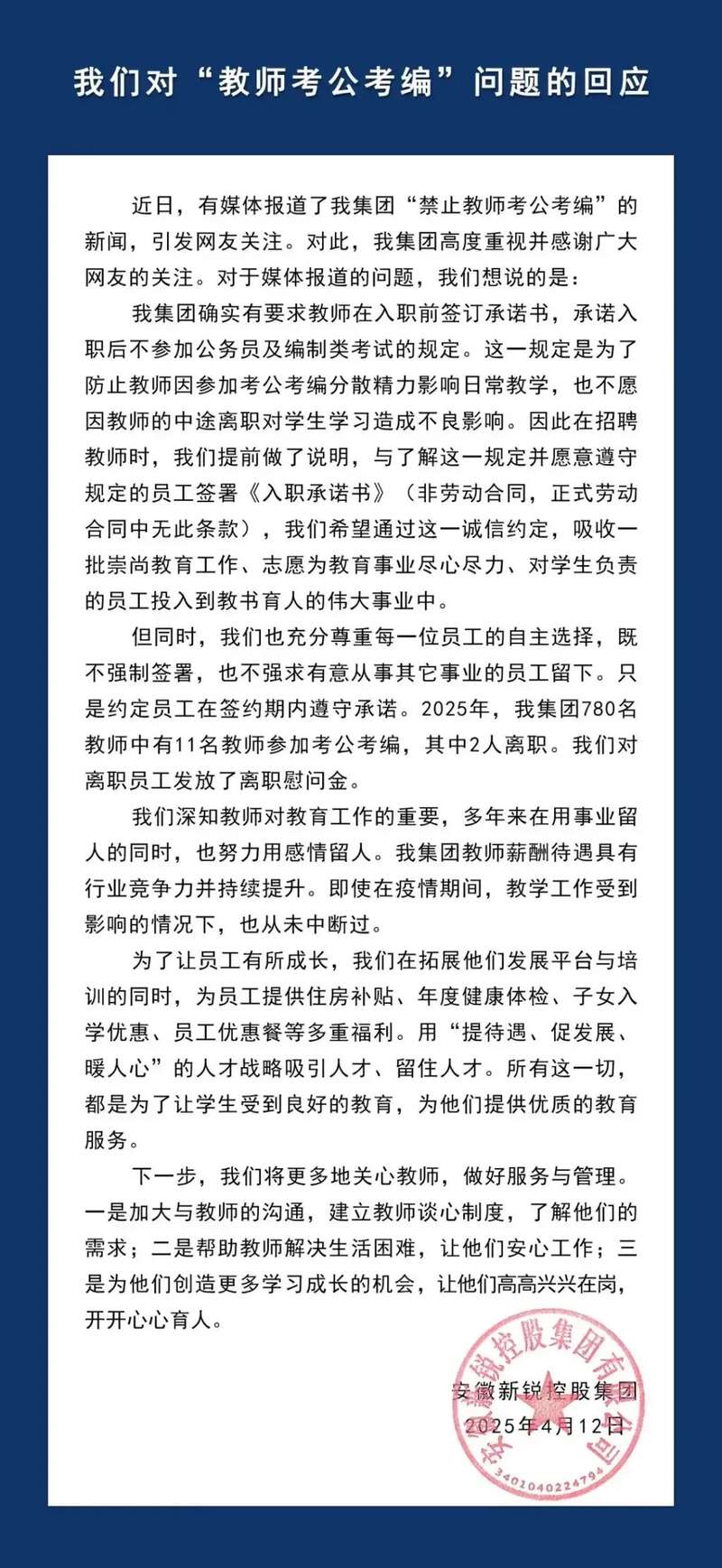 4月14日,安徽省滁州市南谯区教育体育局就“要求新入职教师不得考编”一事公开通报称,目前已纠正,区教体局责成涉事的集团要切实保障教职工合法权益。详情