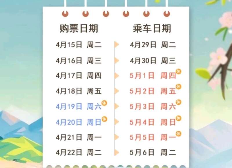 据“中国铁路”官博,今年五一假期为5月1日~5月5日,今日可购买5月5日火车票。