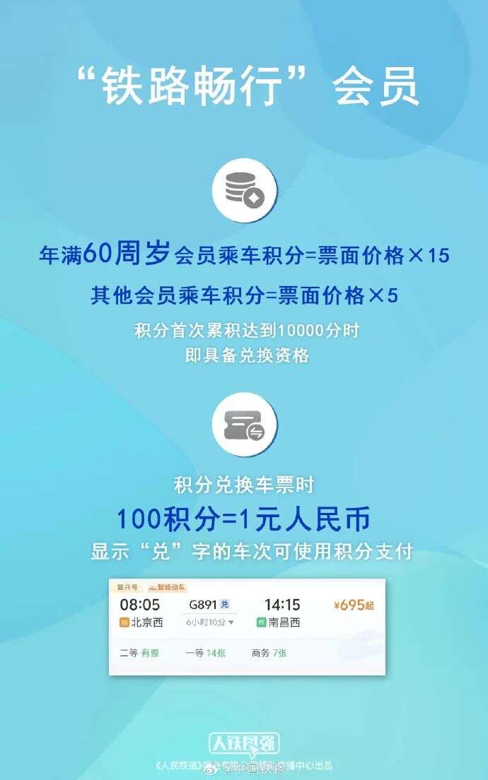 “铁路畅行”会员:“铁路畅行”会员可以享受积分服务,年满60周岁会员乘车积分=票面价格×15。其他会员乘车积分=票面价格×5。积分首次累积达10000分时,即可用于兑换车票,100积分=1元人民币。