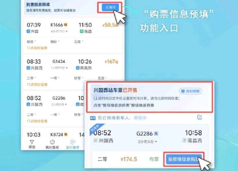 预填信息快速购票:在火车票起售当日,页面点击购票信息预填,旅客即可提前选择乘车人、预选车次、预选席别,火车票起售时便可快速提交订单。