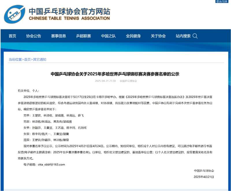 中国乒协表示,根据《2025年多哈世界乒乓球锦标赛决赛选拔办法》及2025年世乒赛决赛参赛资格获取途径的相关规定,综合考虑运动员国内外大赛成绩、对外战绩、抗压能力及兼项配对等因素,以有利于完成本次世乒赛参赛任务为目标,确定了参赛名单。