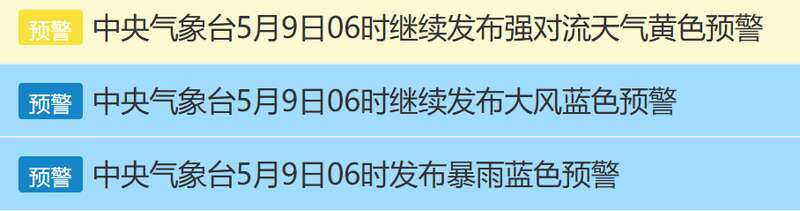 预计,5月9日08时至10日08时,广西东部和南部、广东大部、福建西北部和东南部、海南岛东北部、浙江东南部、华北东部等地部分地区有大到暴雨,其中,广西东部、广东西部等地局地有大暴雨(100~150毫米)。上述部分地区伴有短时强降水(最大小时降雨量30~50毫米,局地可超过80毫米),局地有雷暴大风或冰雹等强对流天气。