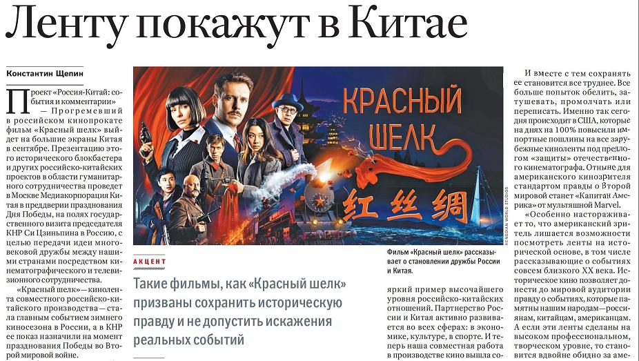 《俄罗斯报》刊文《中俄合拍电影〈红丝绸〉将在中国上映》