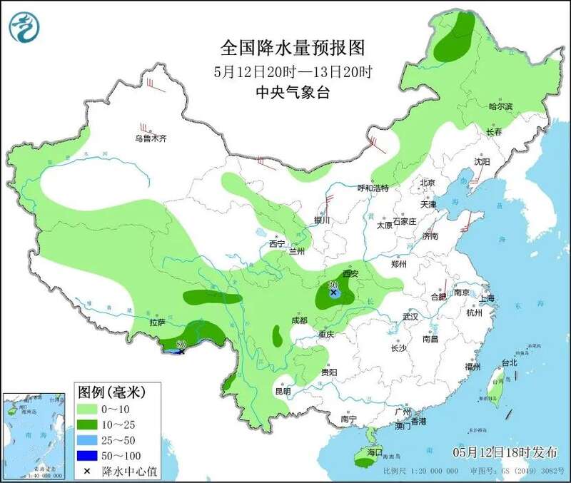 内蒙古东北部、黑龙江西北部、西藏东部、陕西南部、四川盆地东北部、海南岛南部等地部分地区有中到大雨,其中,西藏南部等地部分地区有暴雨。