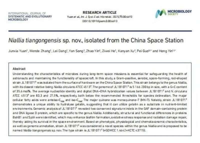 近日,科研人员首次公布在我国空间站发现的一个微生物新物种,并将其命名为“天宫尼尔菌(Niallia tiangongensis)”,相关科研成果在线发表于国际权威期刊《International Journal of Systematic and Evolutionary Microbiology》上。查看详情