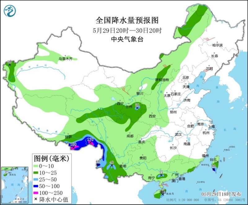 内蒙古东北部、黑龙江西北部、新疆南疆西部山区、西藏东部、青海东部、甘肃南部、宁夏南部、川西高原北部、云南西部、广东东南部沿海、海南岛、台湾岛等地部分地区有中到大雨,其中,西藏东南部、云南西北部等地部分地区有暴雨或大暴雨。